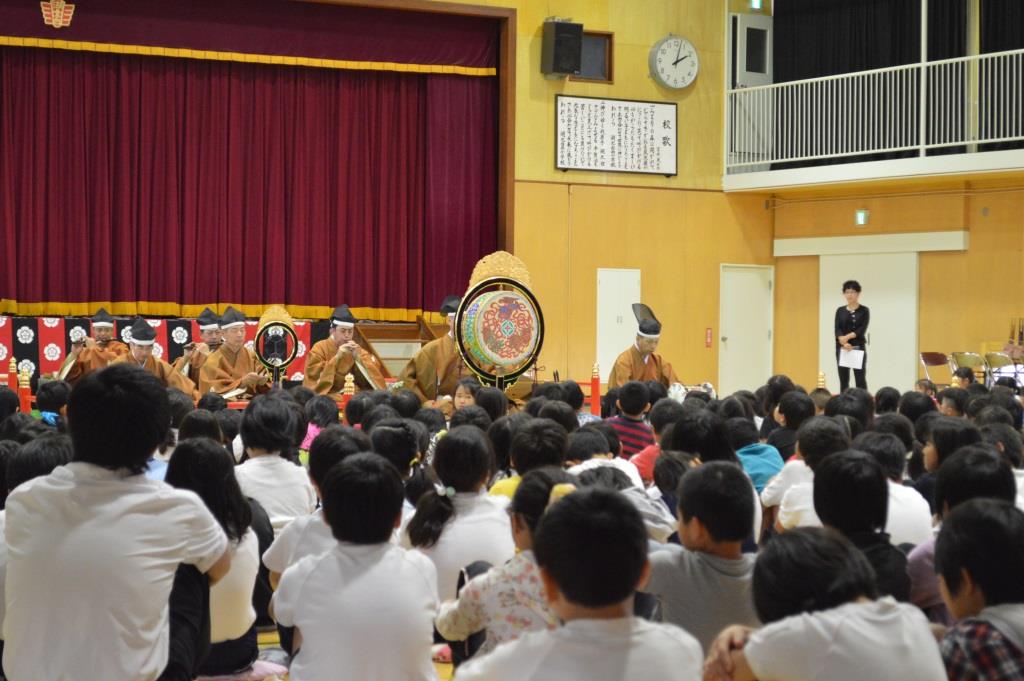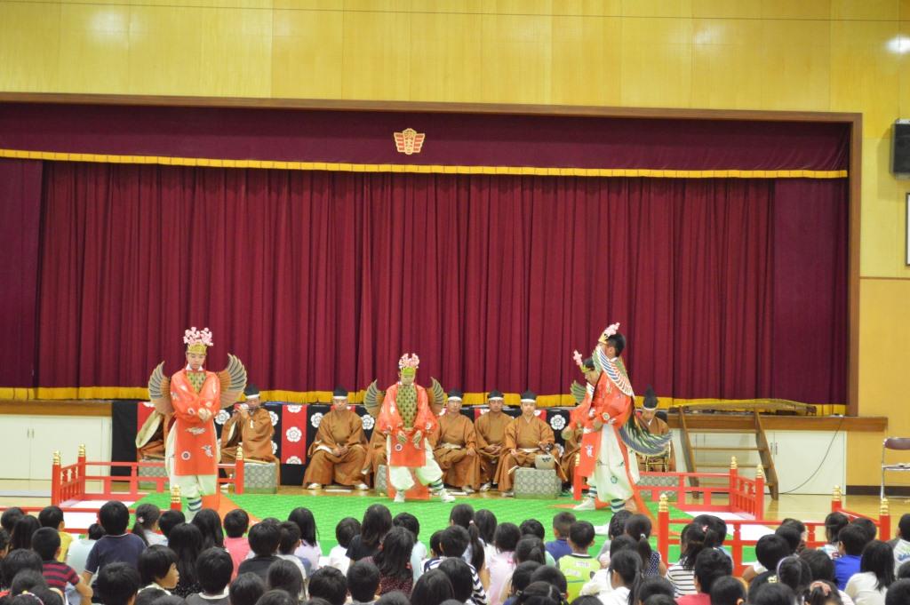 第3回目は我孫子市立湖北台西小学校です。当校は毎年10月1日の創立年日に芸術鑑賞会を開催しています。本年はこの芸術鑑賞会で雅楽の鑑賞と体験が行われました。 全学年346名を対象に鑑賞が、6年生63名が体験教室を行いました。 鑑賞は管絃が「平調越殿楽」と舞楽「迦陵頻」、それに楽器体験も行いました。