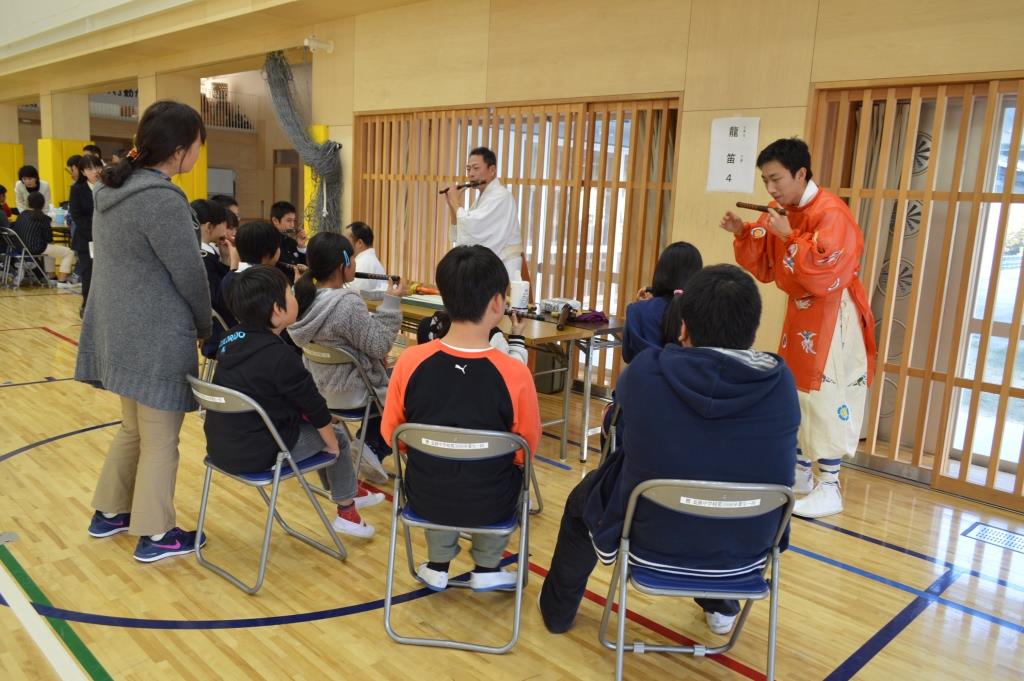 今年度最後となる第6回は小中一貫教育校の鴨川市立長狭学園です。 この地域は、明治天皇即位の時の大嘗祭で斎田とされた主基(すき)斎田があったところで、雅楽とは縁の深い土地です。 1年生から9年生(中学3年生)約300名を対象に管絃「平調越殿楽」と舞楽「迦陵頻」の鑑賞を行いました。また6年生と8年生(中学2年生)は楽器体験・舞の手体験も行いました。
