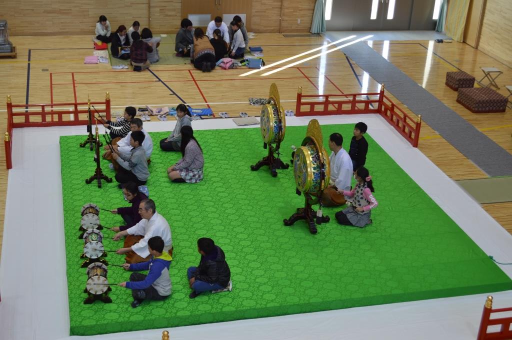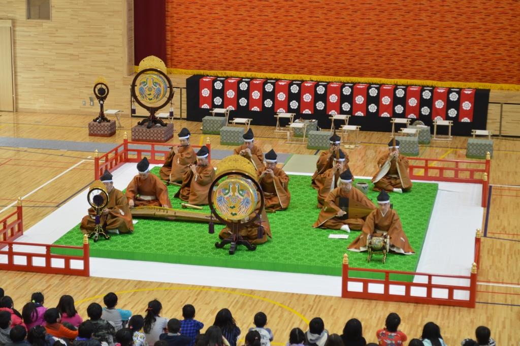 第5回目は九十九里海岸の、間近に太平洋を望む栄小学校です。 全校生徒(158名)が管絃「平調越殿楽」、舞楽「迦陵頻」を鑑賞し、体験学習は5・6年生(60名)が楽器と舞楽の舞の手を行いました。
