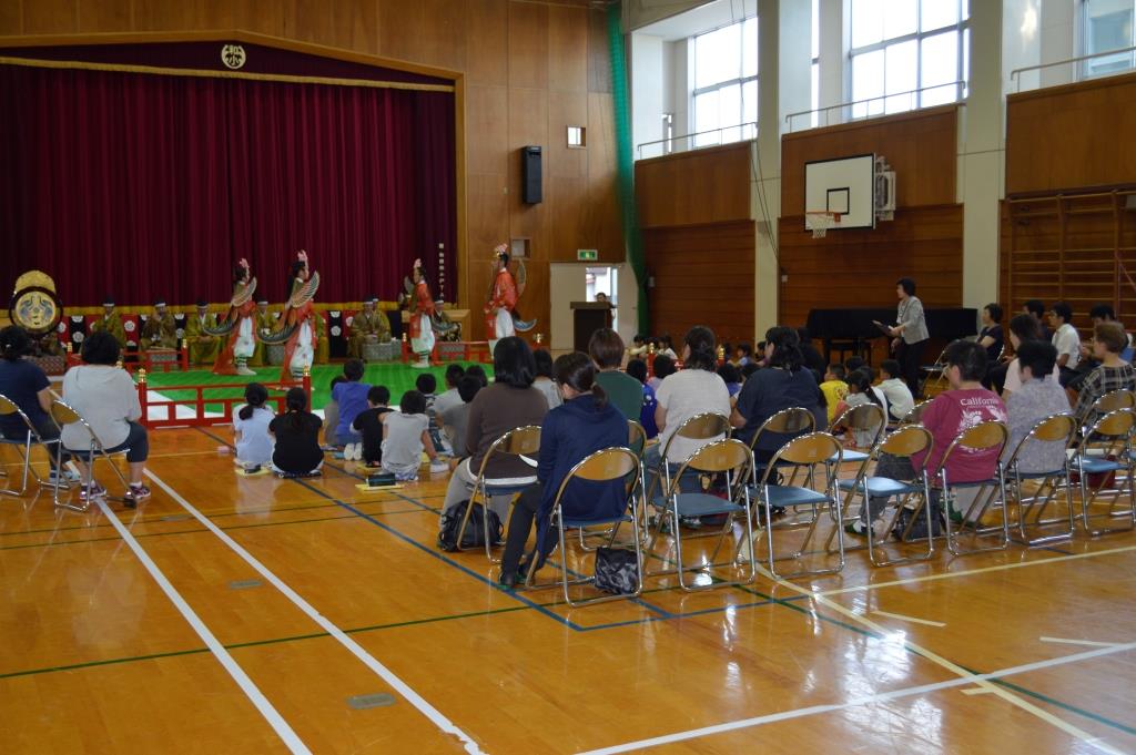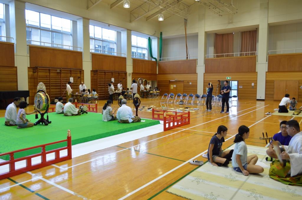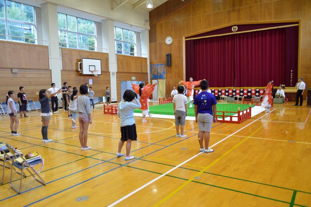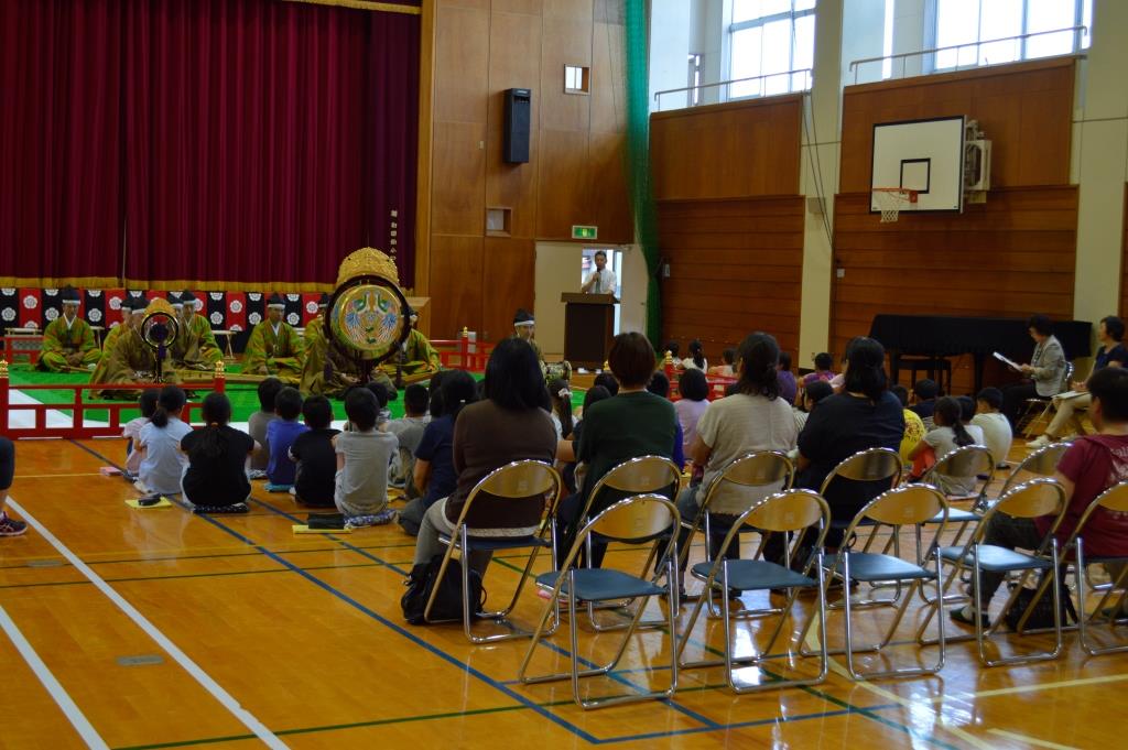 2回目は太平洋に臨む高台にある南房総市の和田小学校です。 鑑賞は管絃「平調音取」「越殿楽」を全校児童52名が、 5・6年生17名が楽器と舞楽の舞の手を体験しました。