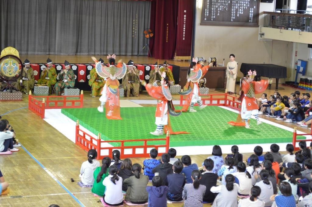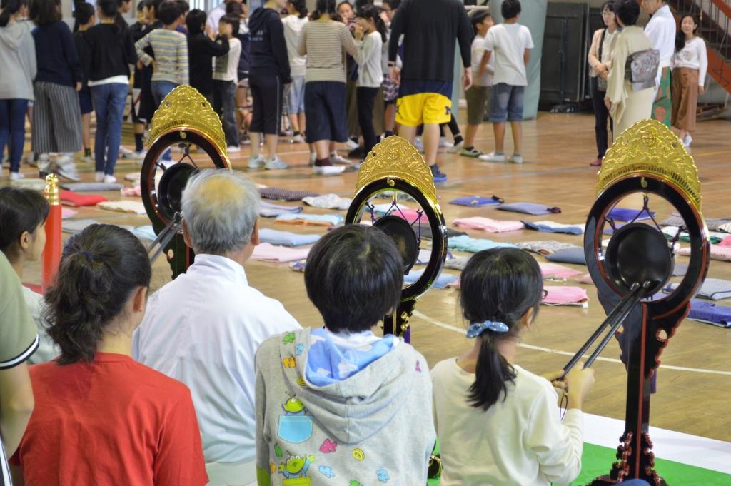 ① いつもの体育館とは違う立派な舞台と雰囲気に入場してきた時からワクワクしていました。目の前で、初めて雅楽の演奏を聴き、またその楽器を実際に体験できて、それぞれに感じる者があったようです。