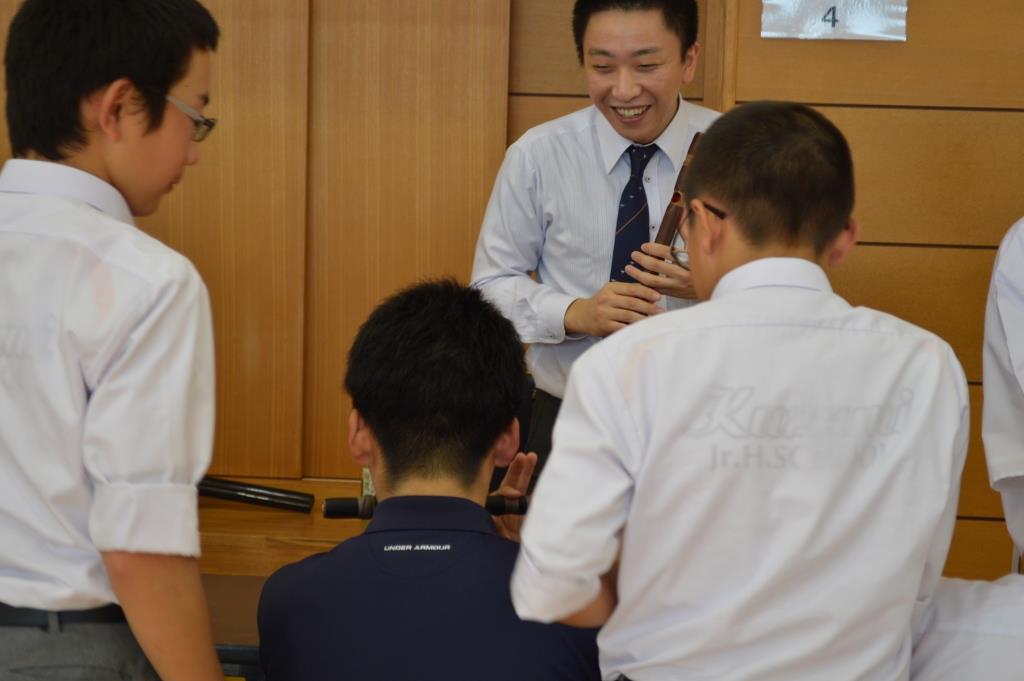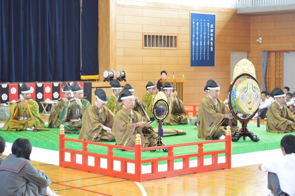 今年度第3回目は成田市の久住中学校です。 2020年の東京オリンピックの日本の玄関に当たる成田市にあるということで、異文化理解と国際親善に力を入れている学校です。 全校生徒116名を対象に、管絃「平調越殿楽」と舞楽「迦陵頻」の鑑賞と楽器体験を行いました。