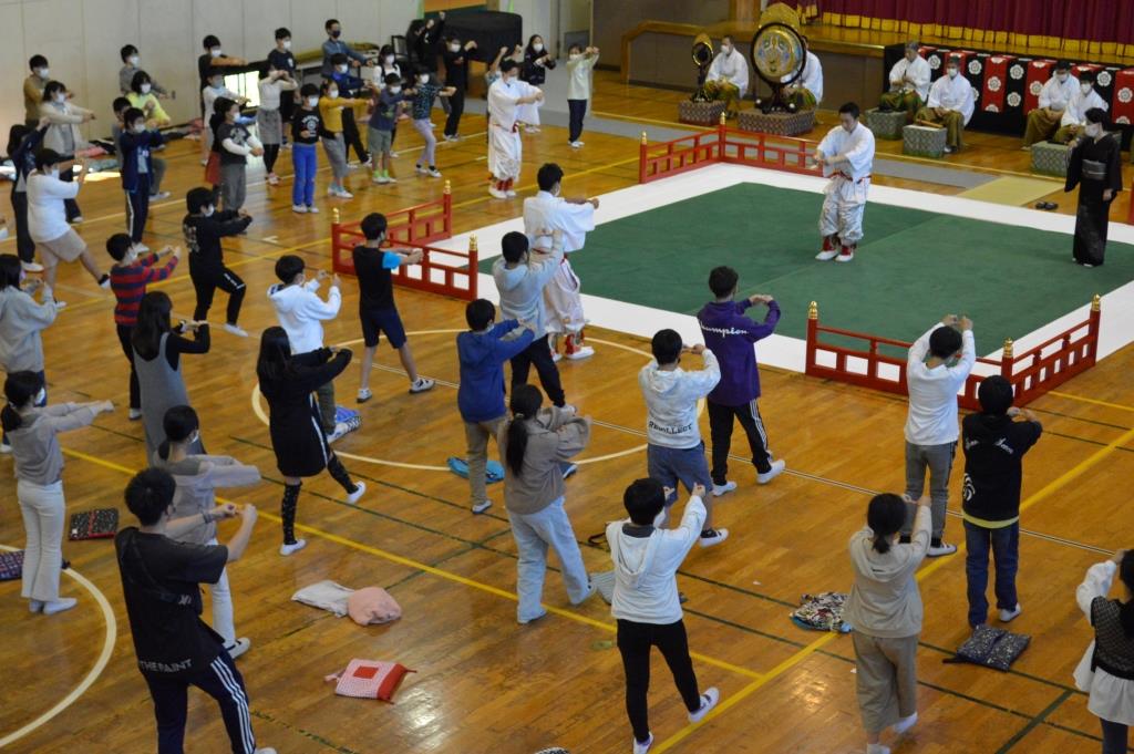 今回も感染拡大防止に最大限の注意をはらい、体育館の扉は開け放たれ、また児童は距離をおいての鑑賞となりました。