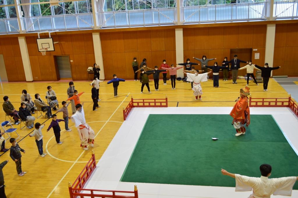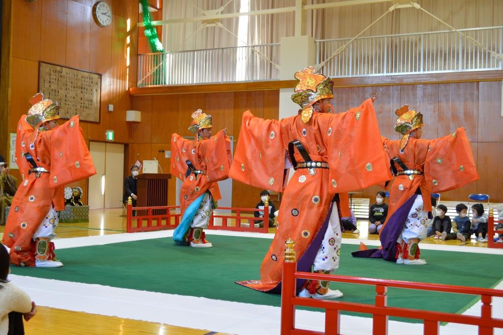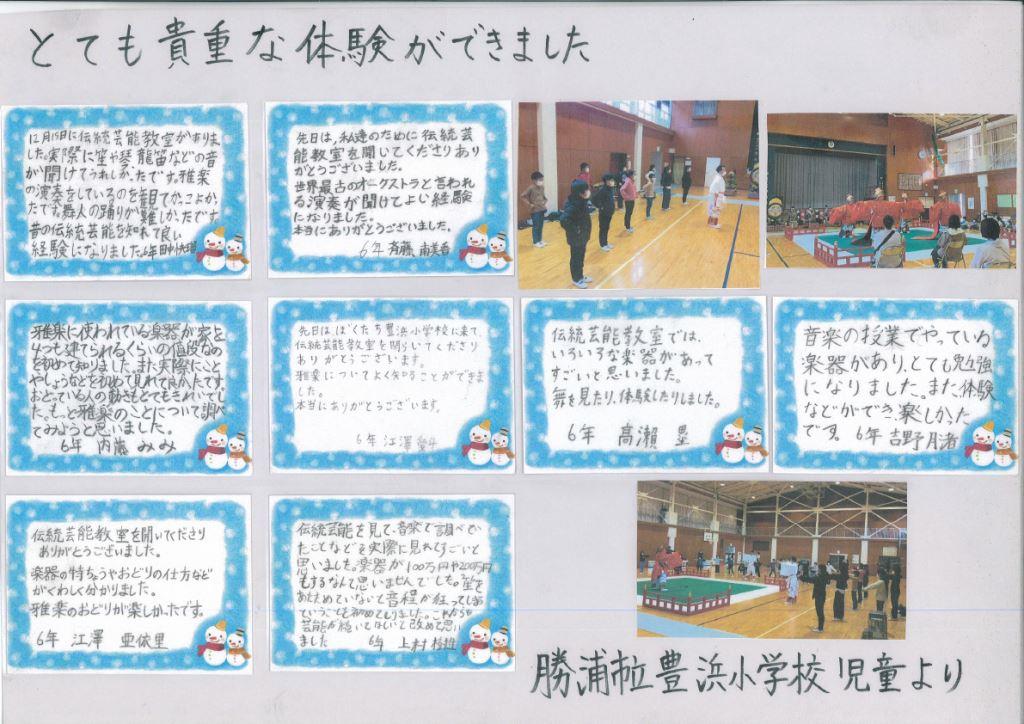 明治7年創立の伝統ある勝浦市の豊浜小学校でふれあい体験事業が行われました。 1~6年生31名が管絃「平調越殿楽」と舞楽「輪臺」の鑑賞と舞楽体験を行いました。 COVID-19が再び拡大するなか、感染拡大防止に最大限の注意をはらっての実施となりました。