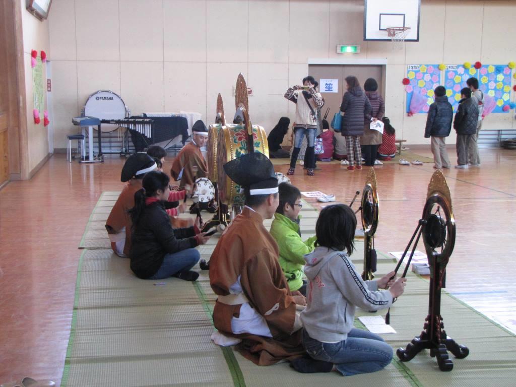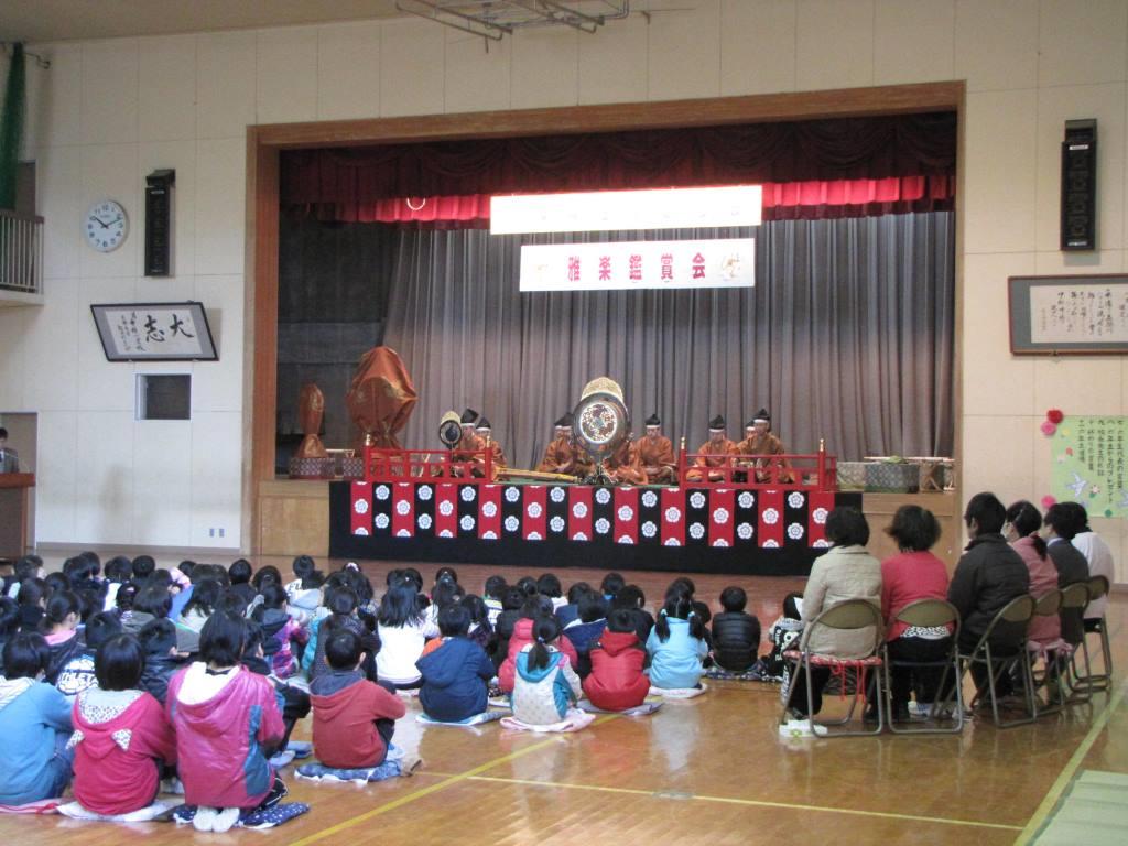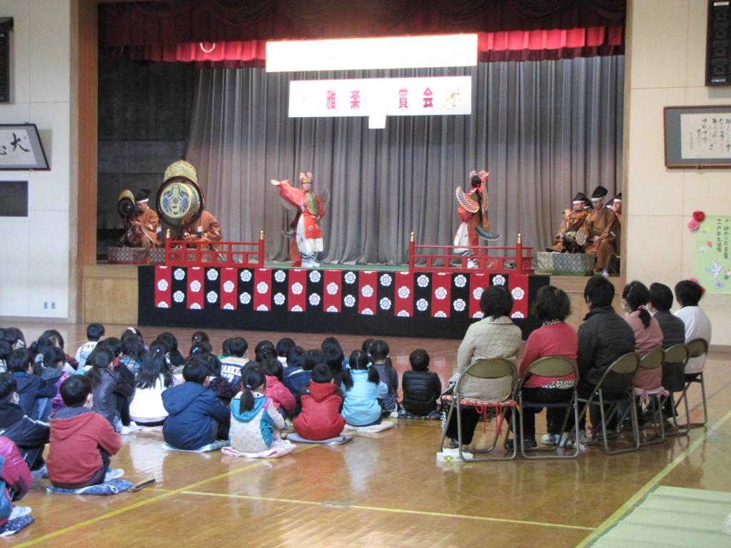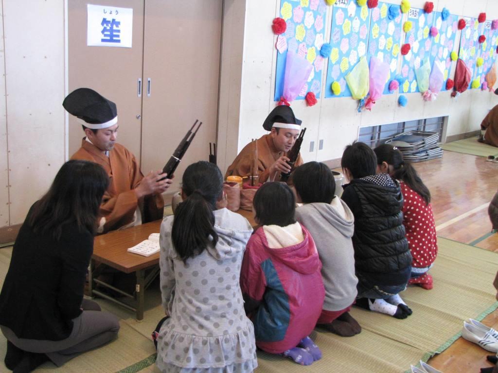 3月5日 千葉県いすみ市の中根小学校の「6年生を送る会」の一環として、全児童対象の雅楽鑑賞会と、5・6年生対象の雅楽体験教室が開催されました。 6年生による「越殿楽今様」の楽器演奏ののち、当アンサンブルが管絃「平調越殿楽」、舞楽「迦陵頻」を奏しました。 参加した児童からは、「初めて聞いた」「予想してたのと違う音だった」などの意見が聞かれました。