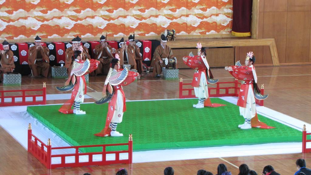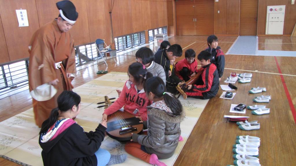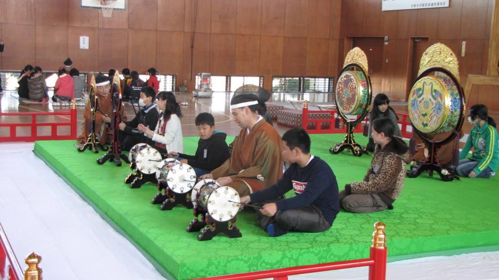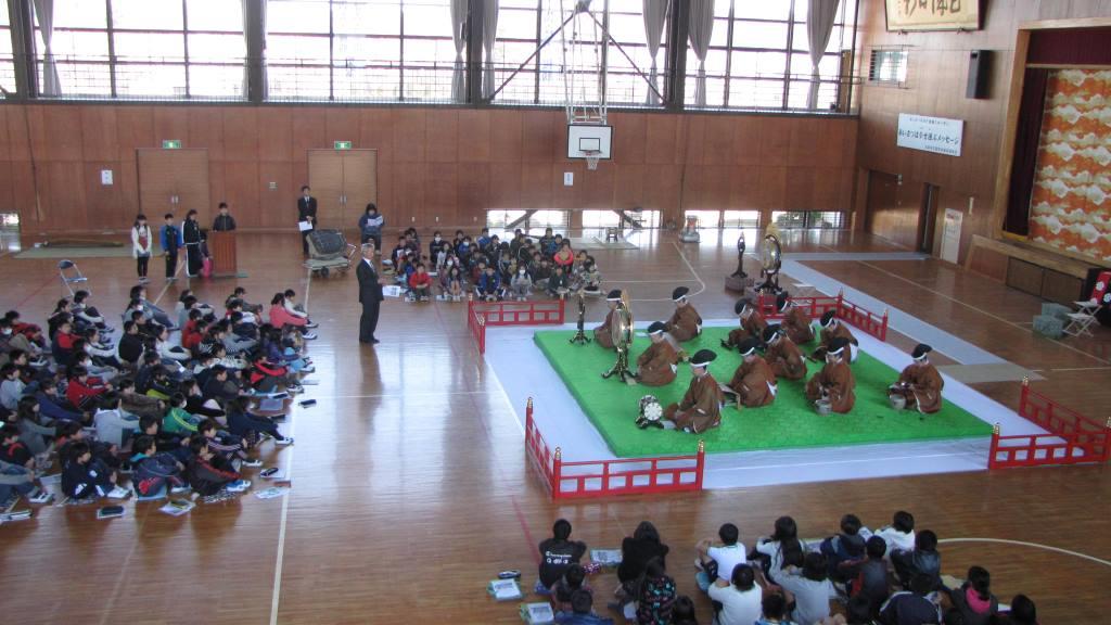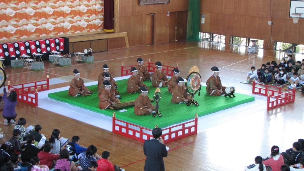 2014年1月27日、当アンサンブルの地元、千葉県いすみ市の太平洋に臨む大原小学校にて「雅楽体験教室」を開催しました。同校では他にも琴、三味線、尺八などの邦楽鑑賞会を開催するなど、日本文化に高い関心を寄せています。 鑑賞会では「管絃:平調越殿楽」「舞楽:迦陵頻」を5・6年生150名が鑑賞し、次いで6年生70名が楽器体験をしました。