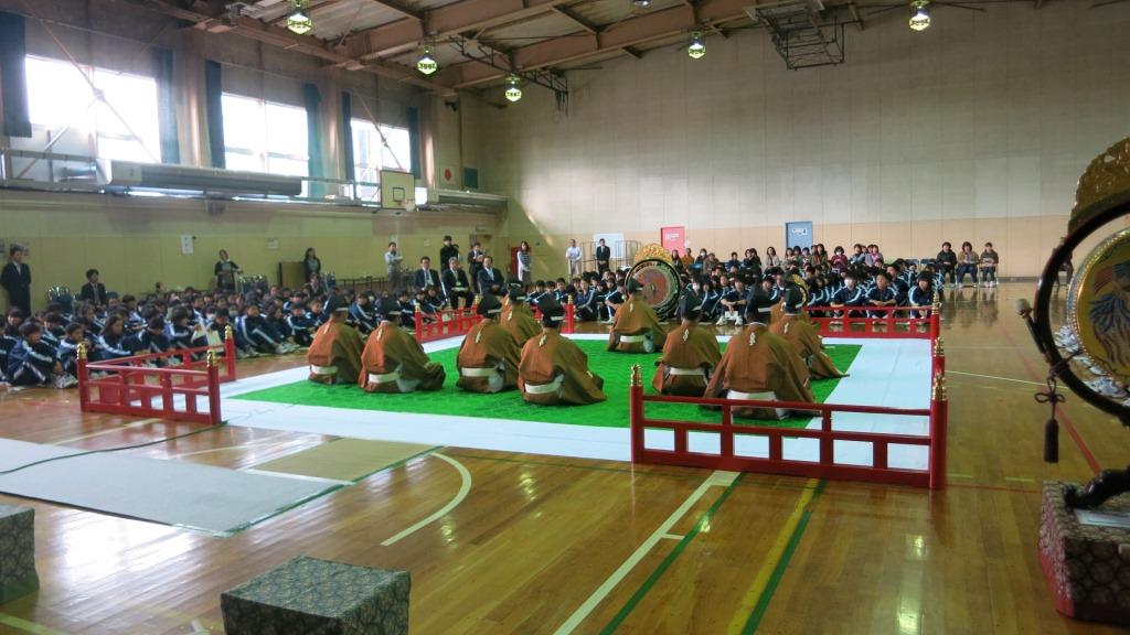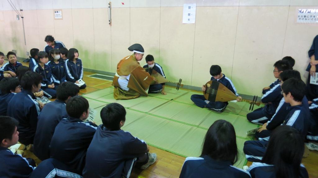 鑑賞では管絃「平調音取」「越天楽」、舞楽「陵王」を披露しました。初めて触れる雅楽に生徒たちは真剣な眼差しで演奏に聞き入っていました。