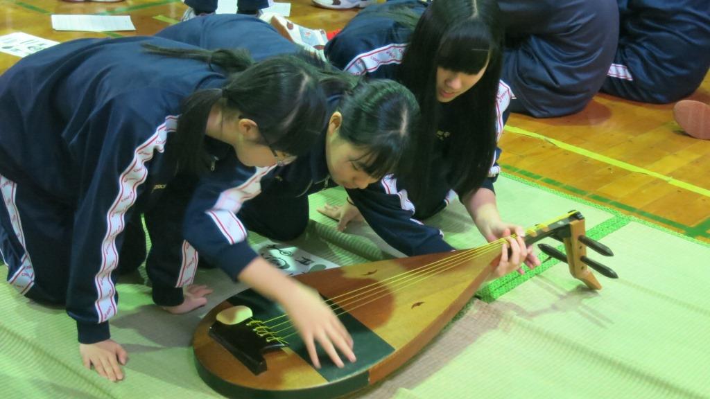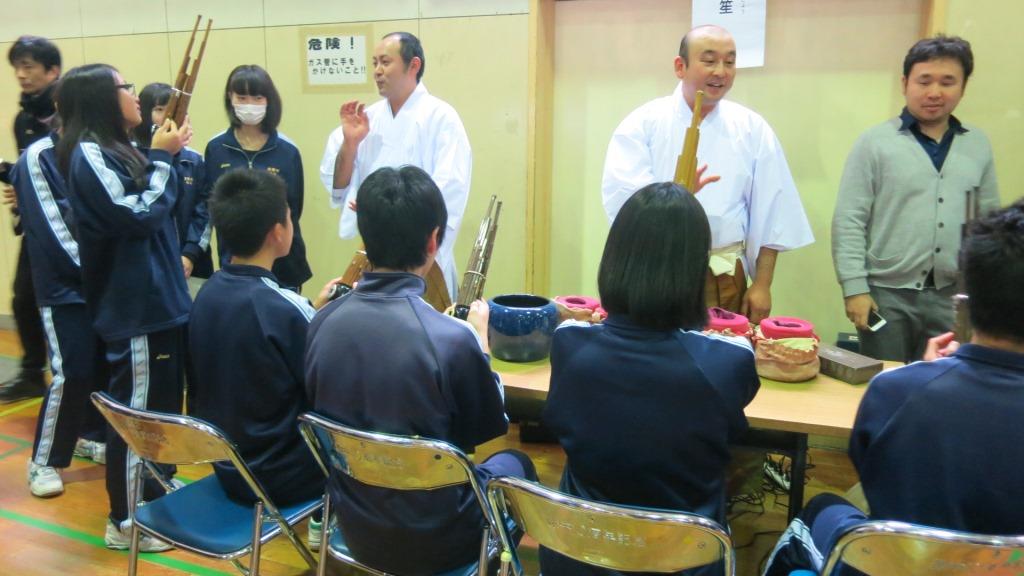これに先立ち、前日の21日には登別市立緑陽中学校にて雅楽鑑賞と体験教室を実施、全校生徒380名に教職員と父兄も参加しました。