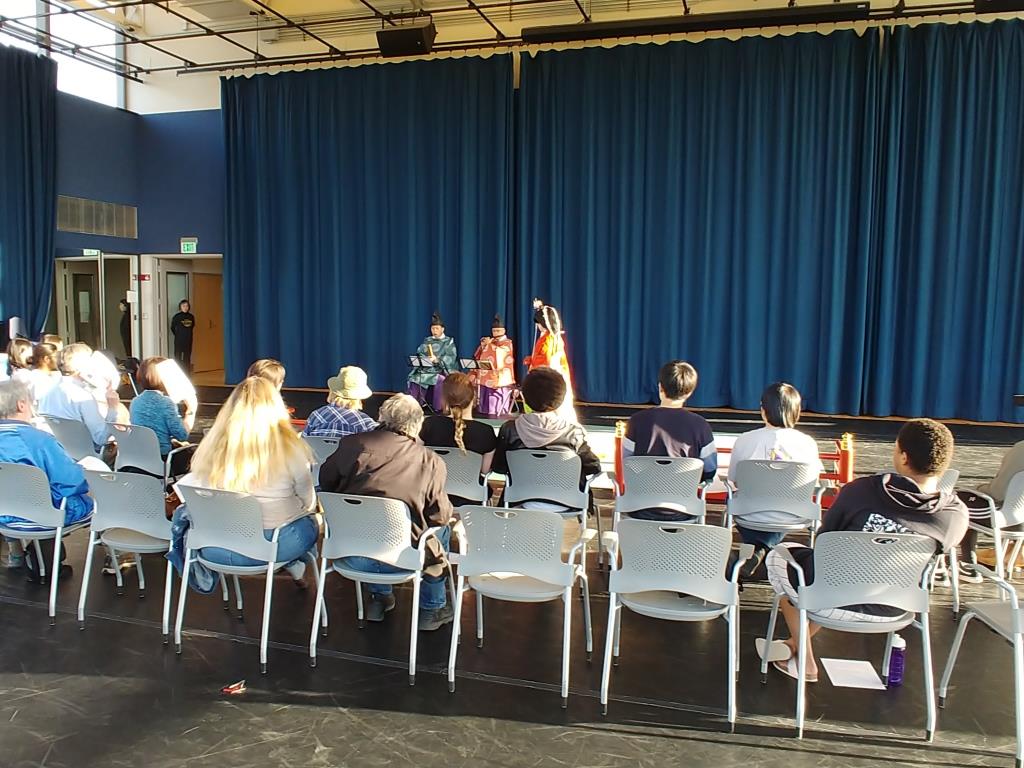 その後同じ会場で公演を実施しました。参加者は同大学の教師、学生など約50名。前半は安齋先生の龍笛独奏(賀殿急含め二曲)と越殿楽の合奏、後半は五節舞を演しました。同じタイミングで大学内では三つのイベント、また来週の卒業シーズンを控えていたため、人数は少なかったものの、「素晴らしい演奏をありがとうございます。学生達は日本の伝統音楽を体験することが出来、大変ラッキーだと思います。」との感想を来場者からいただきました。