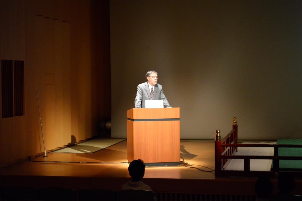 第一部は、テキサス大学物理学科上級研究員のトミオ・ペトロスキー教授による講演。テーマは『物理学で雅楽を語る~副題:日本と西洋の文化の違いから眺めた物質と生命と人間』。教授は、物理学の「複雑系」「散逸構造理論」(ノーベル化学賞受賞・イリヤ・プリゴジン博士)を切り口に、「雅楽とカオス」について、さまざまな角度から、ユーモアたっぷりに話しを展開されました。雅楽演目の一つである「乱声」の音階のカオス性に焦点を当てた大阪府立大学物理学科の卒業研究生の研究内容も紹介されました。西洋の永遠不滅性、存在性か、決定論的か、東洋の一過性、無常性か、偶然性(予測不可能)か。西洋の「在る世界」か、東洋の「成る世界」か。現在、科学界が大きく変遷しつつある状況を解き明かして下さいました。アジアに集大成された「雅楽」を物理学的見地からアプローチされた画期的な講演であったかと思います。