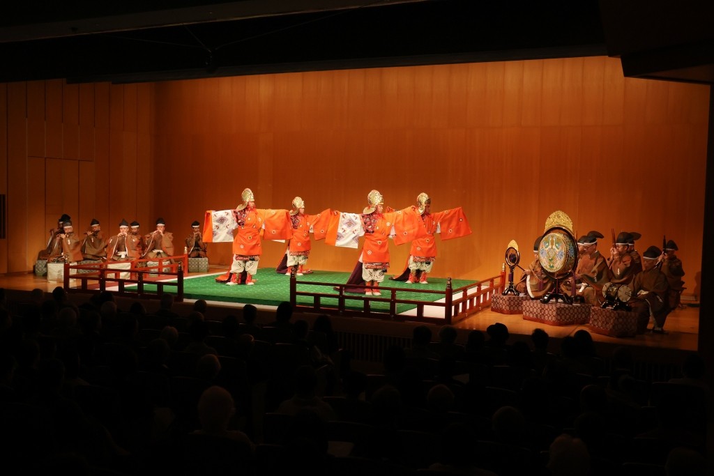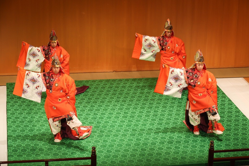 第二部は、元宮内庁楽部首席楽長の安齋省吾先生、宮内庁現役楽師(重要無形文化財保持者)の大窪貞夫先生、久恒壮太郎先生に特別出演いただき雅楽を演奏。管絃、舞楽とも力強い演奏に迫力を感じました、それぞれの楽器が調和がとれて、美しい旋律に魅了された等、初めて雅楽に触れた観客からも、称賛の声が多く寄せられました。 |