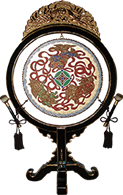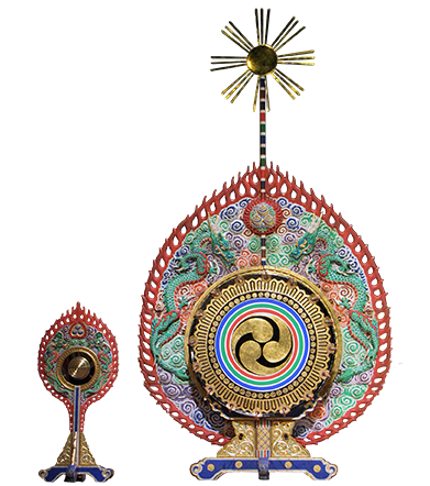 正面から見て左側の左方は龍、太陽、金色、向かって右側の右方は鳳凰、月、銀色でデザインされ、前者は陽・奇数、後者は陰・偶数を象徴しています。