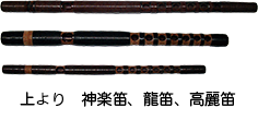 雅楽の横笛には龍笛、高麗笛、神楽笛の三種がありますが、管絃に用いられるのはこのうち龍笛のみです。主笛(おもぶえ)とも呼ばれます。