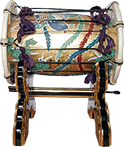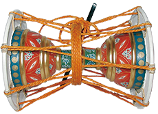 高麗楽の演奏の際に用います。砂時計を横にしたような形で、筒状の木の両端に枠にはめた皮をかけ、調緒(しらべお)と呼ばれる紐でしめています。