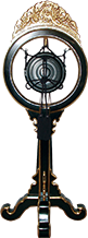 雅楽で唯一の金属楽器です。皿型をした金属を、丸い木枠に三方から紐で固定しています。2本の桴の下端を両手で持って演奏します。鉦鼓は「打つ」といわず、「摺(す)る」といい、片方だけで摺る場合と、両方を続けて摺る場合があり、両手で摺るときは、必ず左桴を一瞬早く摺ります。