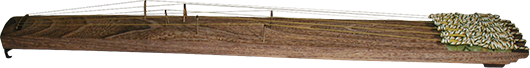 水平に構え、撥(ばち)で弾きますが、メロディーを奏でるのではなく、低い音の絃から高い音の絃に向かって複数の絃を鳴らすアルペジオ奏法が基本です。
