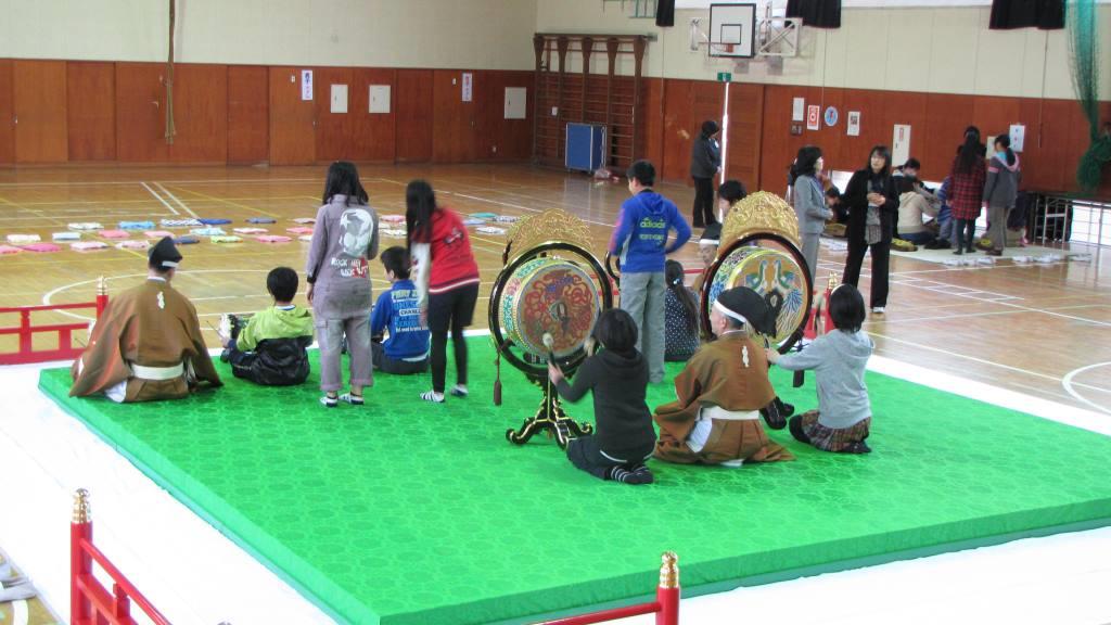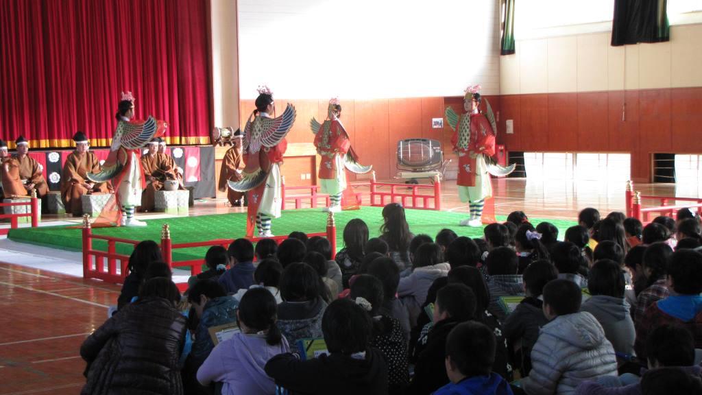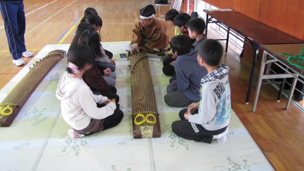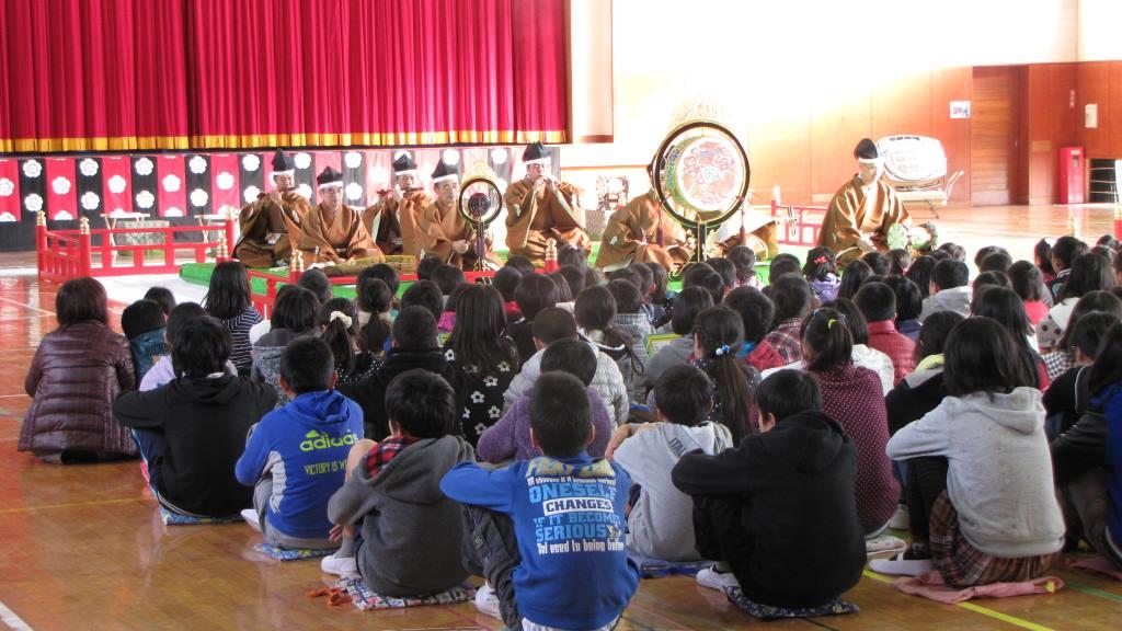 5回目となる器楽クリニックは、明治6年創立という長い歴史と伝統のある君津市立中小学校にて開催されました。 3年生から6年生までの200名が管絃「平調越殿楽」と舞楽「迦陵頻」を鑑賞し、次いで6年生60名が楽器体験を行いました。