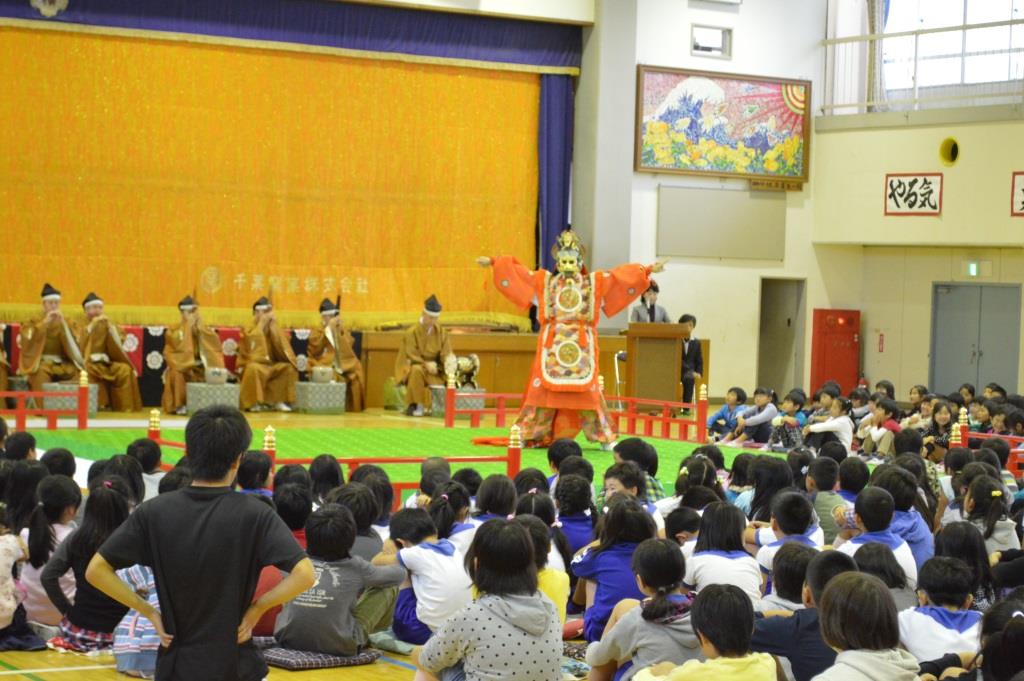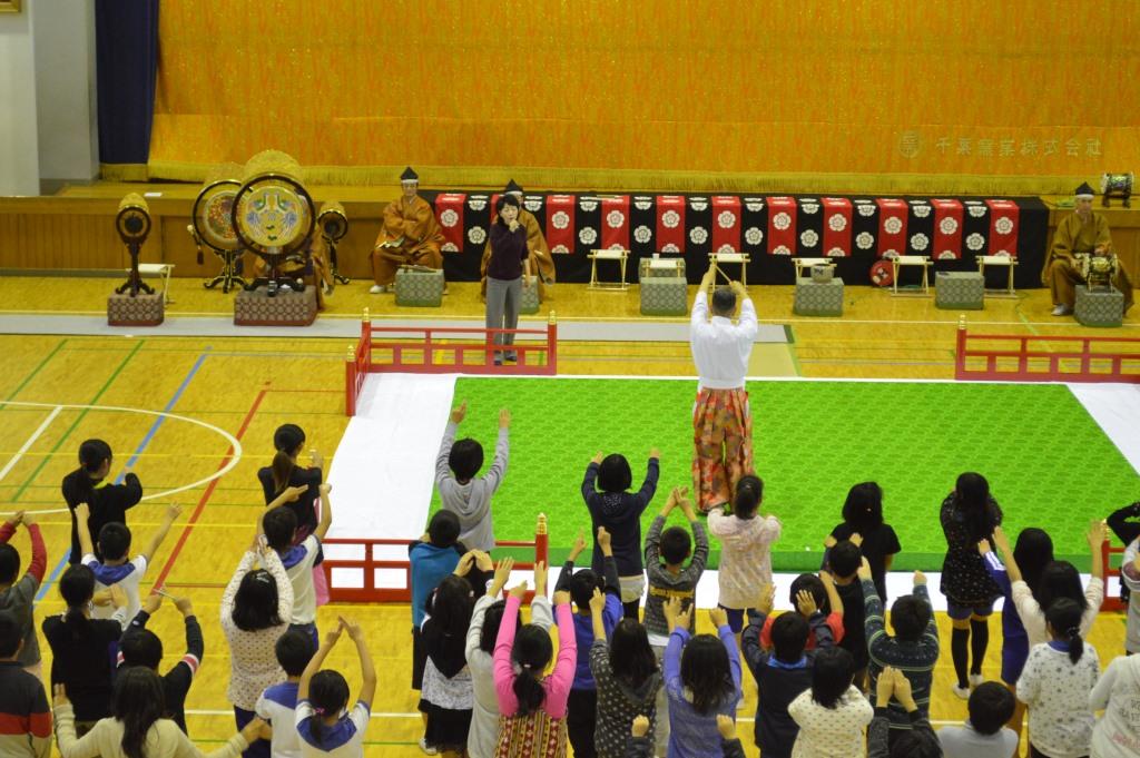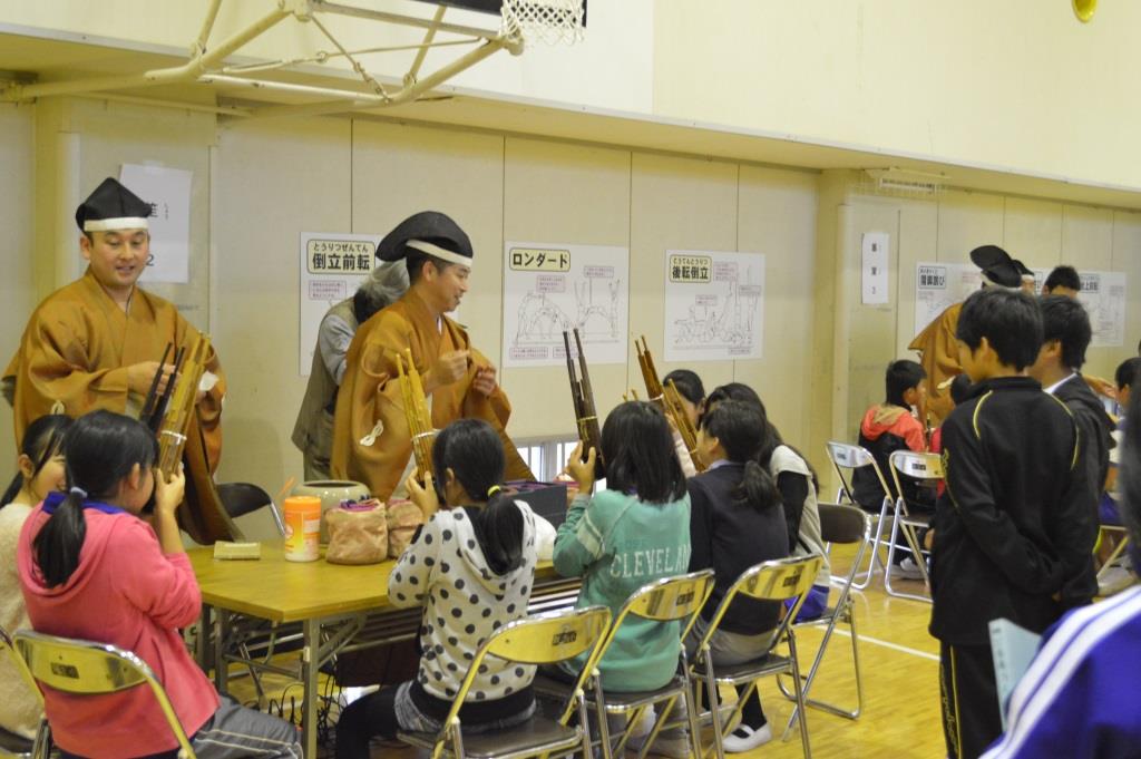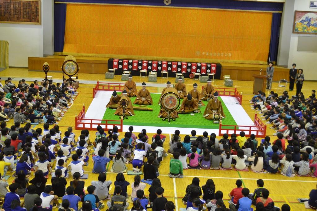 ① 雅楽の演奏を実際に鑑賞し、とても貴重な時間をいただきした。子供たちの反応は、普段の音楽の授業では西洋の音楽や楽器に触れることが多く、雅楽の楽器の音色や種類に興味を持ったようです。