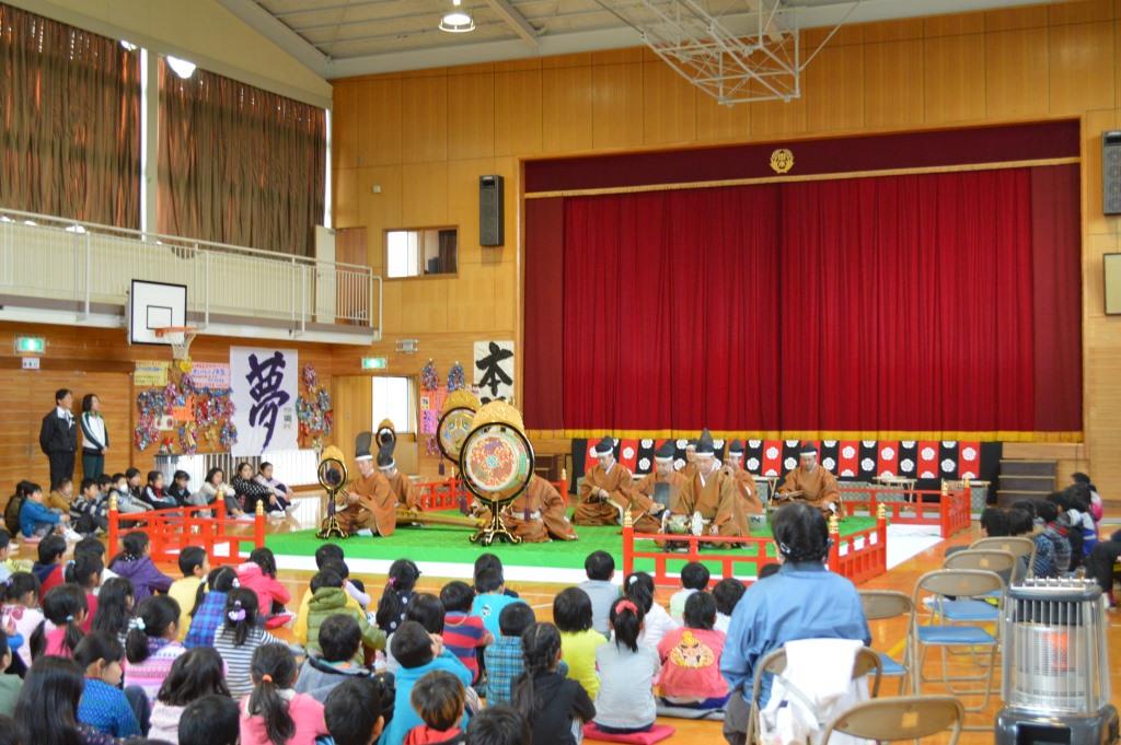 第5回目は、関小学校にて開催されました。 鑑賞は全学年136名、体験教室は4・5・6年生64名を対象に行いました。 鑑賞は管絃が「平調越殿楽」と舞楽「陵王」、体験は楽器と舞楽の舞の手を行いました。