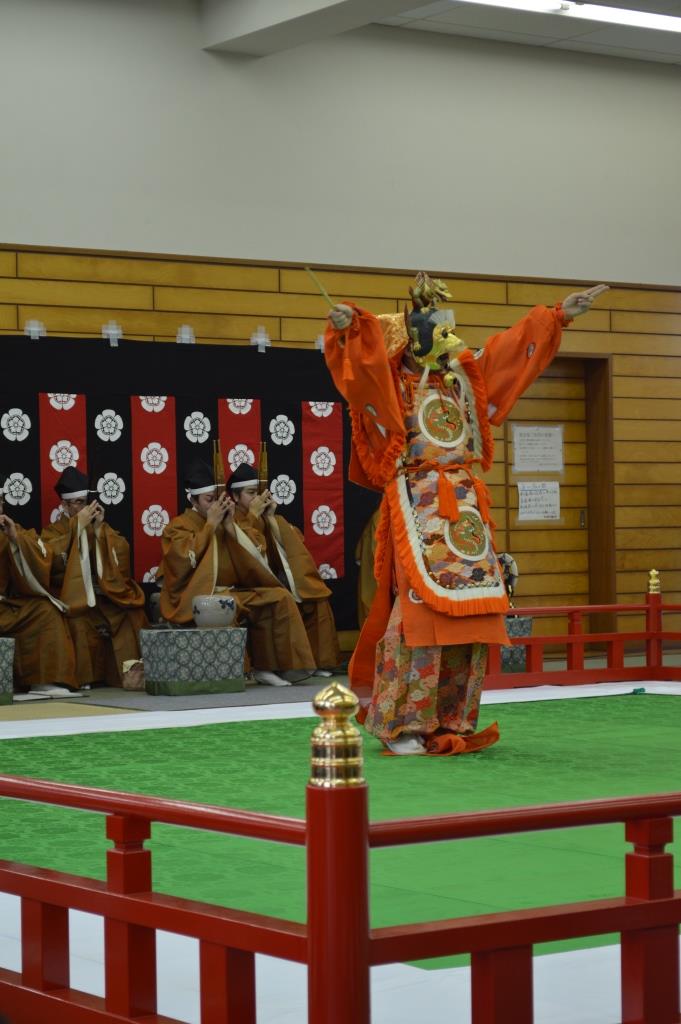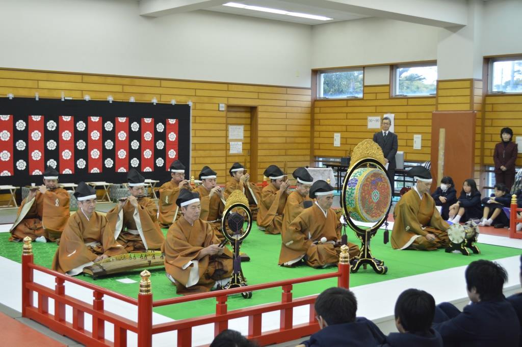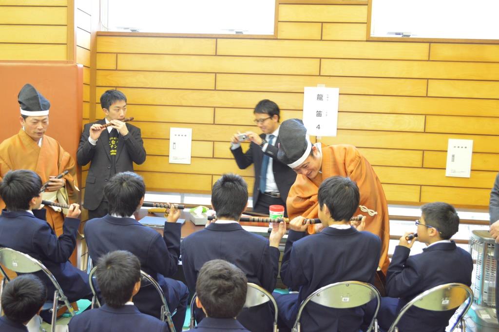 2014年度最後となる第7回目は、入船中学校にて開催されました。 鑑賞と体験教室は1年生とF学級合わせて59名を対象に行いました。 鑑賞は管絃が「平調越殿楽」と舞楽「陵王」、体験は楽器と舞楽の舞の手を行いました。