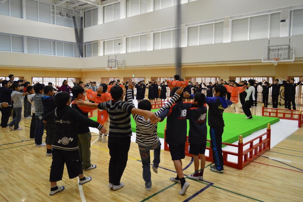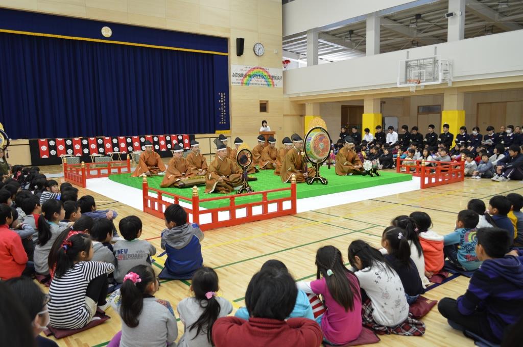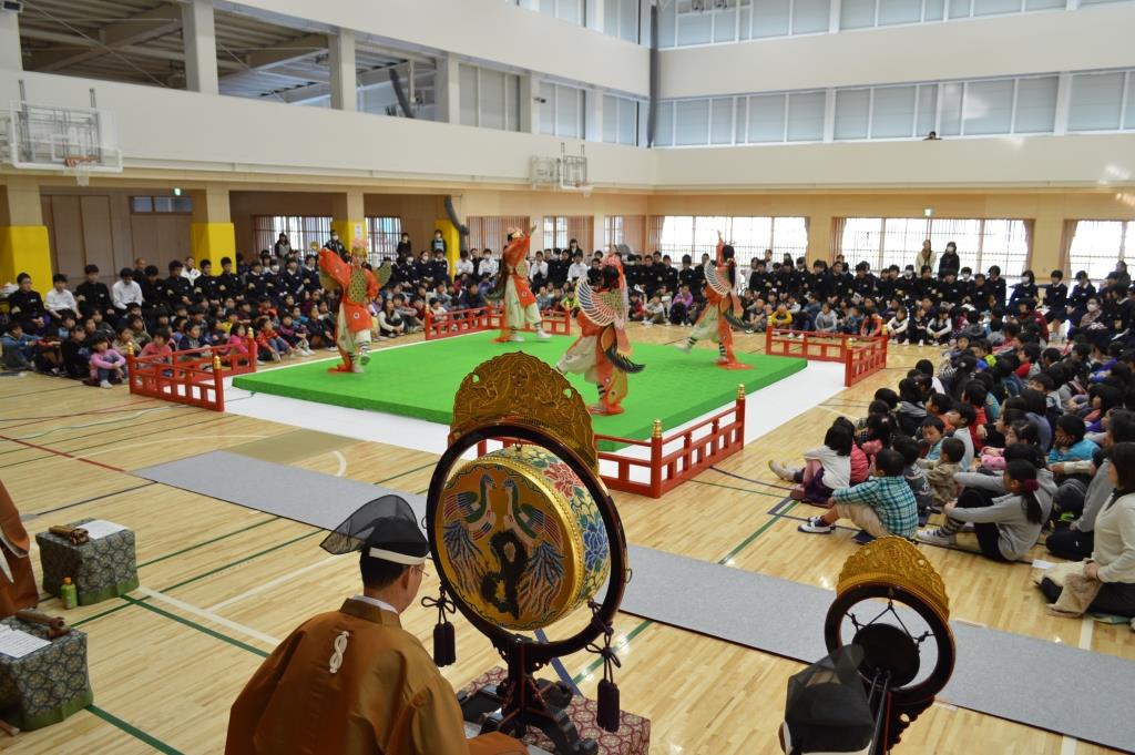 今年度最後となる第6回は小中一貫教育校の鴨川市立長狭学園です。 この地域は、明治天皇即位の時の大嘗祭で斎田とされた主基(すき)斎田があったところで、雅楽とは縁の深い土地です。 1年生から9年生(中学3年生)約300名を対象に管絃「平調越殿楽」と舞楽「迦陵頻」の鑑賞を行いました。また6年生と8年生(中学2年生)は楽器体験・舞の手体験も行いました。