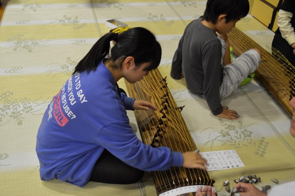 そして越天楽の演奏。始めの音を聴いた瞬間の児童の表情!「なんだこれは!」という戸惑いと驚きの顔。やっと我に返り「越天楽に合わせて歌うんだった…」と思い出したように教科書を見始めます。しかし、あまりのスローテンポにどこを演奏しているのかわからない。仲間と、「いまここじゃない?」と目配せしている姿が見られました。この一連の様子で、児童が雅楽の世界に一気に引き込まれたことが伝わってきました。