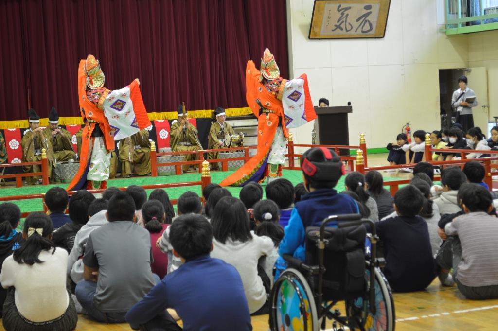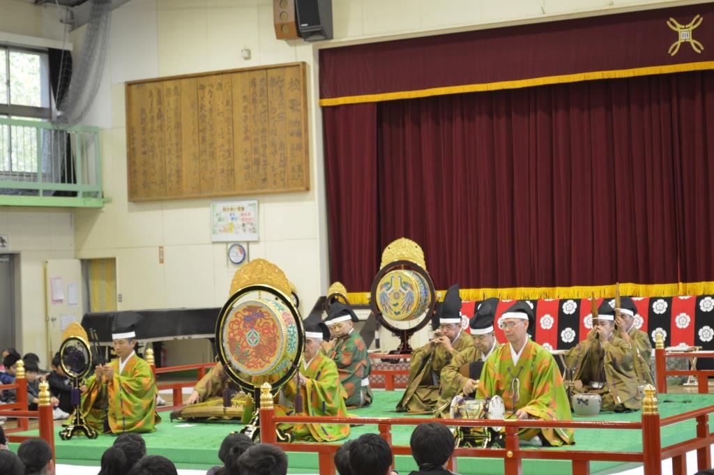⑤ 舞楽が、音に合わせて舞っていたが、一つ一つの動きがゆっくりで、そろっていて雅な感じが美しかったです。平安時代からの8つの楽器の音が合わさって、和の音楽を作っていたが、自分の想像していた音と違っていて、とても面白かったです。