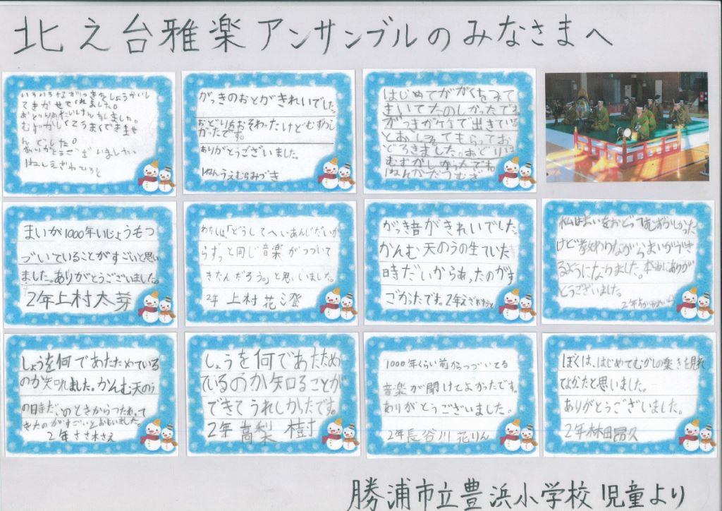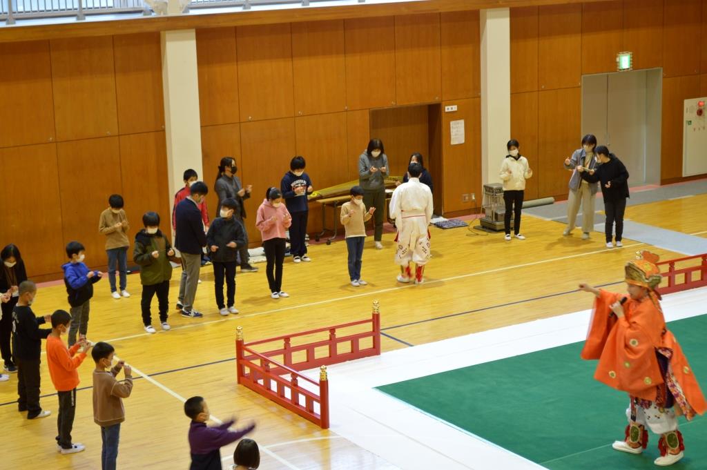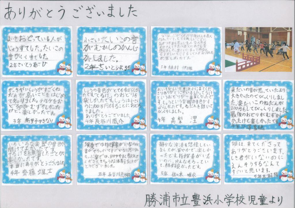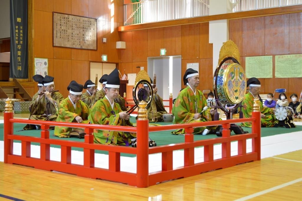 明治7年創立の伝統ある勝浦市の豊浜小学校でふれあい体験事業が行われました。 1~6年生31名が管絃「平調越殿楽」と舞楽「輪臺」の鑑賞と舞楽体験を行いました。 COVID-19が再び拡大するなか、感染拡大防止に最大限の注意をはらっての実施となりました。
