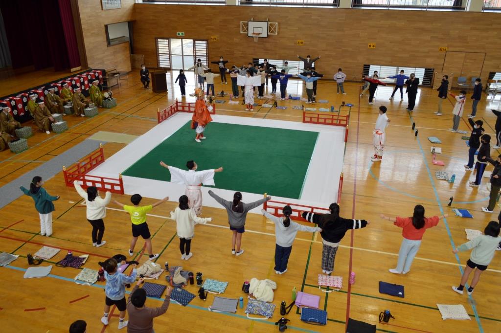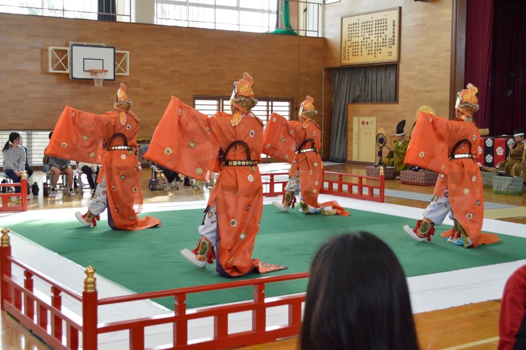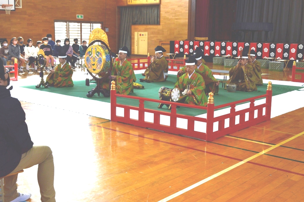 ① 音楽の時間に雅楽を学び、越殿楽をCDで聴いていましたが、やっぱり生で聴くと迫力があってびっくりしました。知らない楽器があって、雅楽で使う楽器を実際に見ることができ、音を聞くことができて勉強になりました。また、舞も丁寧に教えてくれたので、覚えることが出来て嬉しかったです。