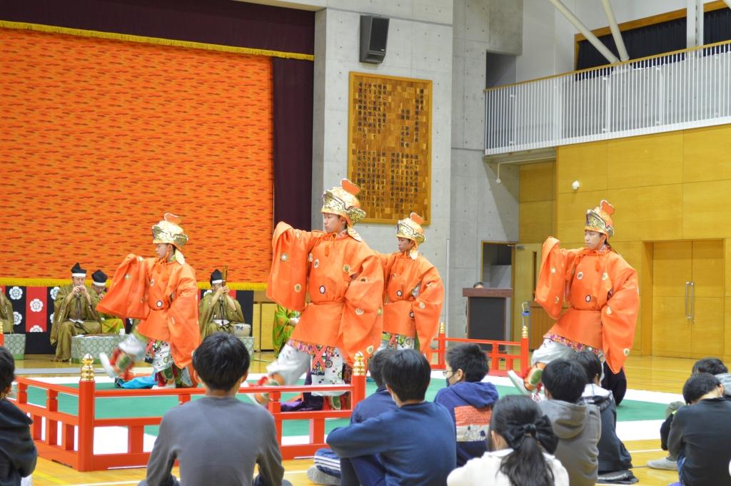 ① 楽器には、天の音と地の音、天と地の間の音が交ざり、今までに聞いたことのない音になっていました。この伝統芸能が千数百年前から続いていることに驚きました。なぜなら、今聞いている音楽や舞が、そのままのかたちで続いているということを知ったからです。なので、このような伝統芸能は大切にしていかなければいけないと思いました。