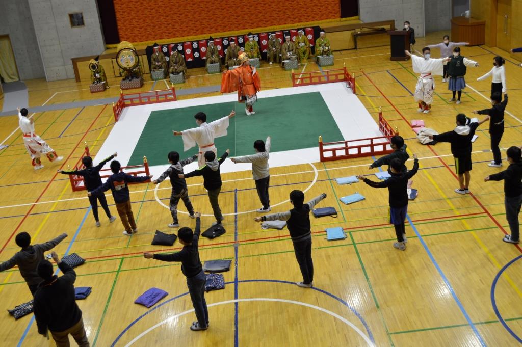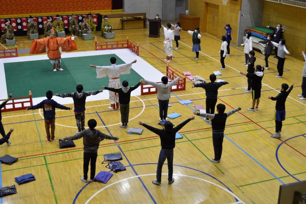 ⑦ 会場に入った時の「和」の雰囲気にまず引き込まれました。これからどんなことが起こるのだろうかと子供たちも興味津々になったことと思います。そして、雅楽の響き、舞、どれもタイムスリップしたかのような雰囲気になりました。体験コーナーでは、ゆったりとした流れの中での舞は、子供たちもあまり経験がなく新鮮な体験だったと思います。衣装を着たままご指導いただいたことで、さらに高まった雰囲気のまま子供たちが体験できたのではないでしょうか。