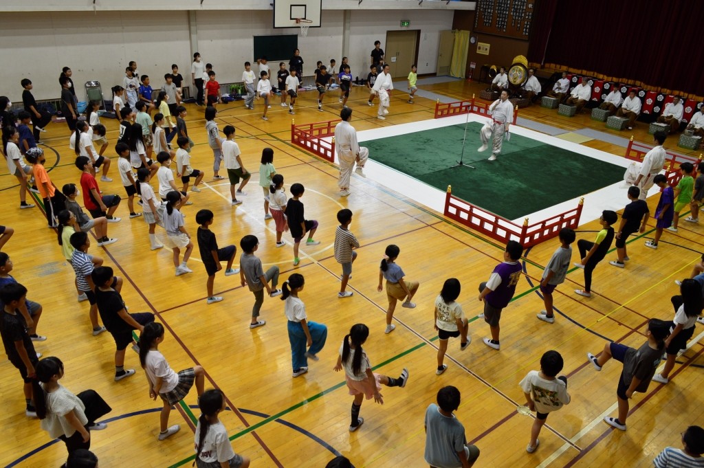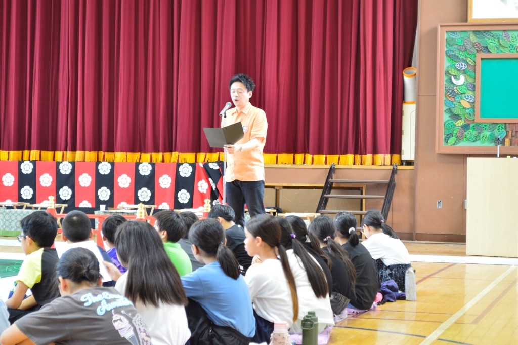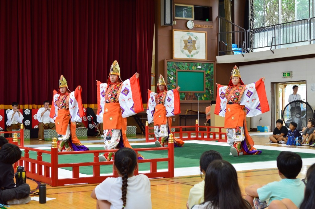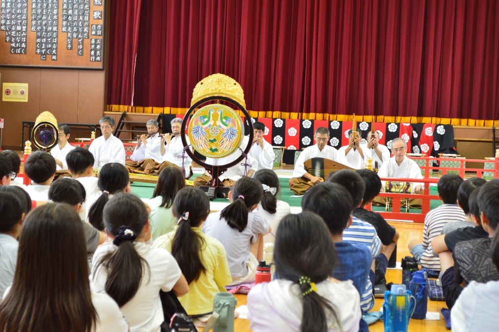 ① 子供たちの豊かな情操教育のために芸術鑑賞教室を実施していますが、伝統芸能の分野は初めてのことだったので、職員、児童にとっても良い体験となりました。絢爛豪華な衣装、荘厳な楽器と演奏を間近で鑑賞したことは勿論、共に体を動かして舞振りをしたことが、子供たちにとって新たな興味関心を湧きたたせるきっかけとなったようです。また質問にも丁寧にお答えくださりありがとうございました。今後の学習指導にも生かしていきたいと考えております。