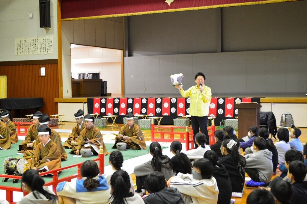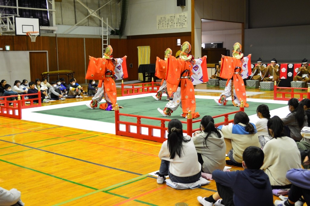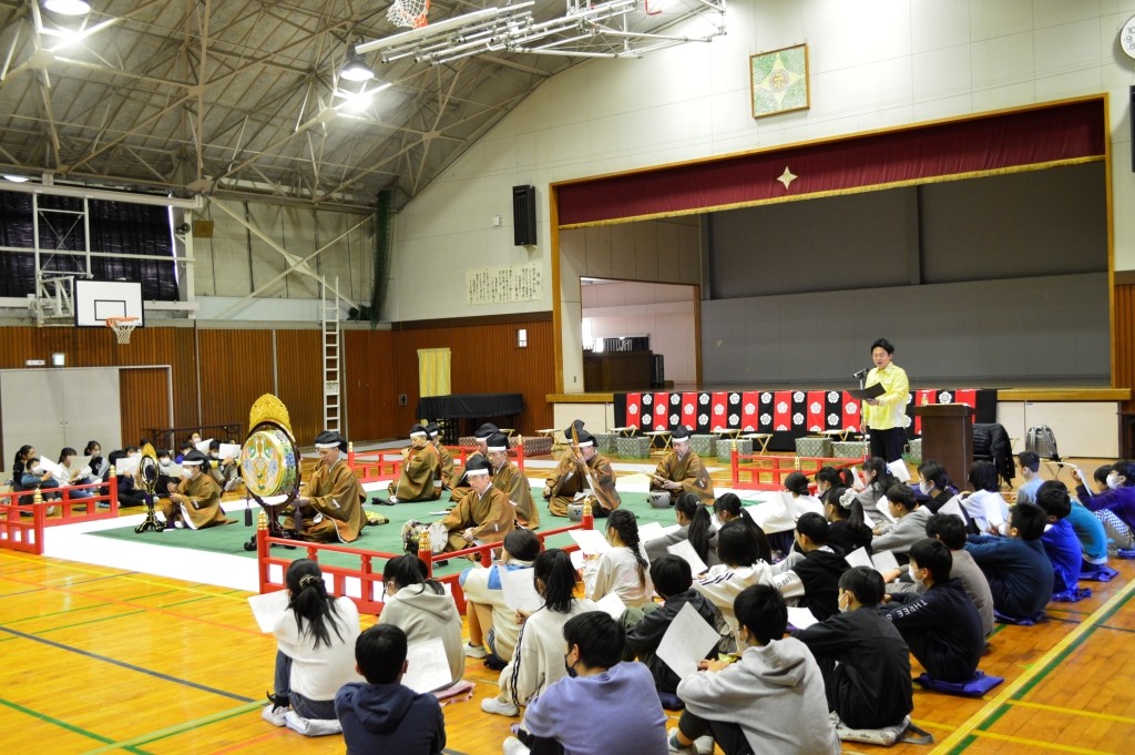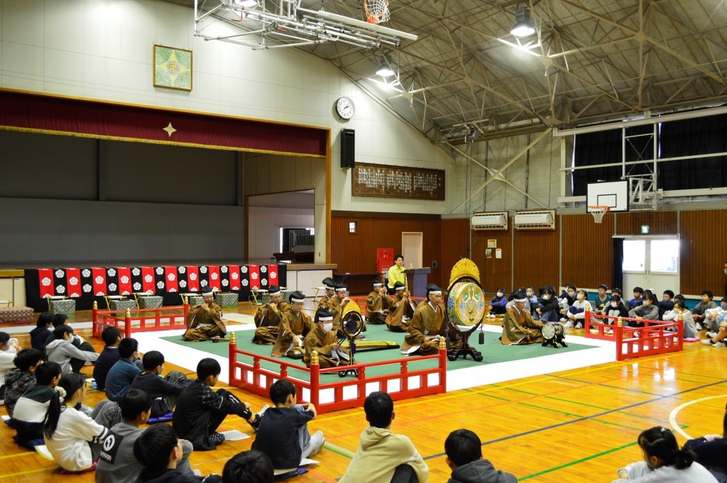 ① 雅楽の生演奏を聴かせていただき、さらには舞の体験をさせていただけたことは、児童にとって本当に貴重な体験となりました。普段の授業において、音源や映像だけで雅楽に興味をもたせることは、なかなか難しいと感じているのですが、参加した児童からは「雅楽の他の曲も聴いてみたい」「他の伝統芸能についても知りたい」といった声も多く聞かれました。児童の興味関心を広げるきっかけを作ってくださったことについても、深く感謝申し上げます。