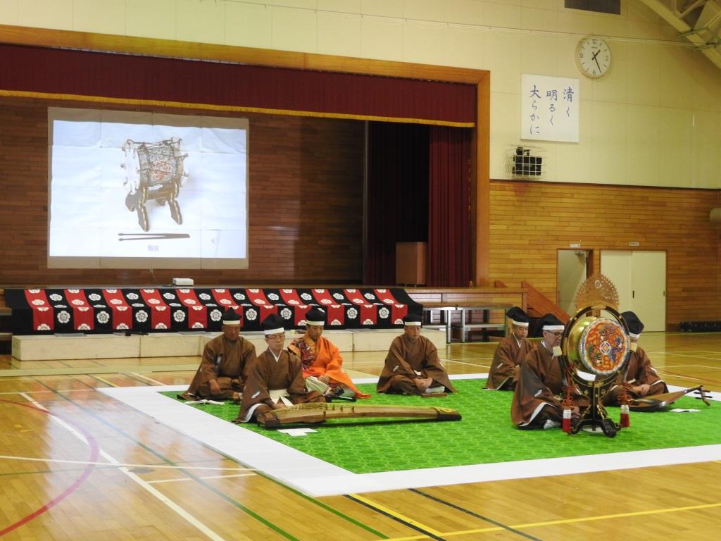 内容:楽器紹介・鑑賞「平調越殿楽」舞楽「賀殿急」・舞楽体験