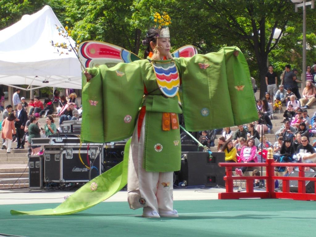 当アンサンブルは、午前と午後に各1回づつ、それぞれ舞楽「陵王」と舞楽「胡蝶」を披露しました。千年を越える舞楽に千人余りのボストニアン達は魅了され、大勢の観衆がカメラにおさめていました。