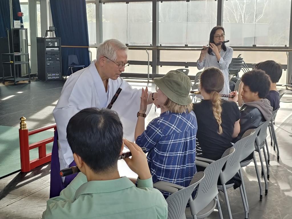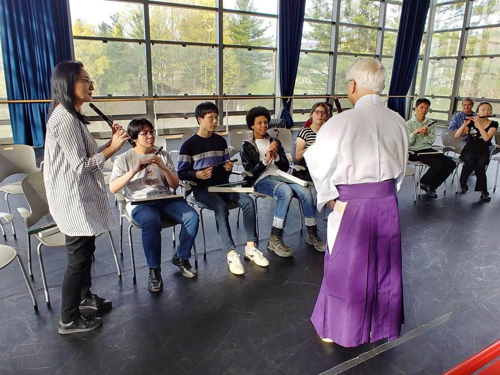 ワークショップは、自然に囲まれた三方ガラス張りのダンススタジオにて、同大学アジア研究学部加賀谷教授と山本教授の学生10名を対象に実施しました。前半は安齋先生が、神楽笛、高麗笛、龍笛それぞれの管楽器で演奏し、後半は学生全員が龍笛を手に、直接、師の手ほどきを受けながら音の出し方を体験、教授を受けました。