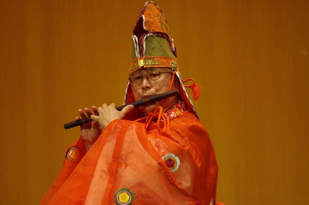 今回もベルギー公演に続き、宮内庁式部職楽部、元・首席楽長の安齋省吾先生に特別出演をお願いし、龍笛、鞨鼓の演奏と、公演の最後に神楽笛の「朝倉音取」の独奏をしていただきました。