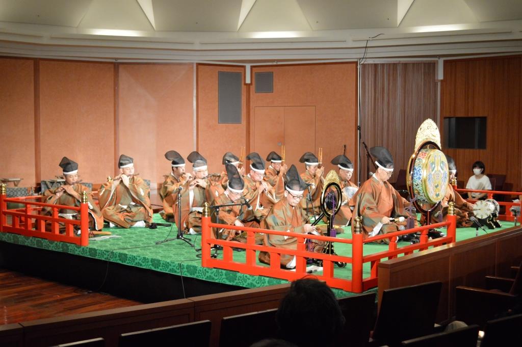 秋晴れの10月15日、東大本郷キャンパスにある伊藤国際学術研究センター内の伊藤謝恩ホールにおいて「第12回雅楽と国際文化交流」を開催しました。9月末で緊急事態宣言は解除されたものの、人数制限等、感染防止対策を行っての開催となりました。当日は、衆議院議員・森英介氏、ベルギー及びインドネシアにおいて日本国特命全権大使を歴任された石井正文氏、前東京大学生産技術研究所所長の岸利治教授をはじめとした多くのご来賓、東大在校生及び一般の方々を含め89名が参加されました。