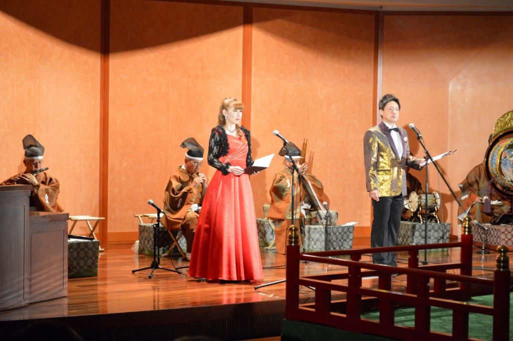 最後に、昨年の「第11回雅楽と国際文化交流」において東西の歌曲を披露いただいた声楽家の日向由子様、ひなたおさむ様を特別出演としてお迎えし、雅楽の伴奏で「越殿楽今様」「さくらさくら」を演奏しました。