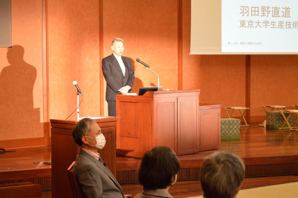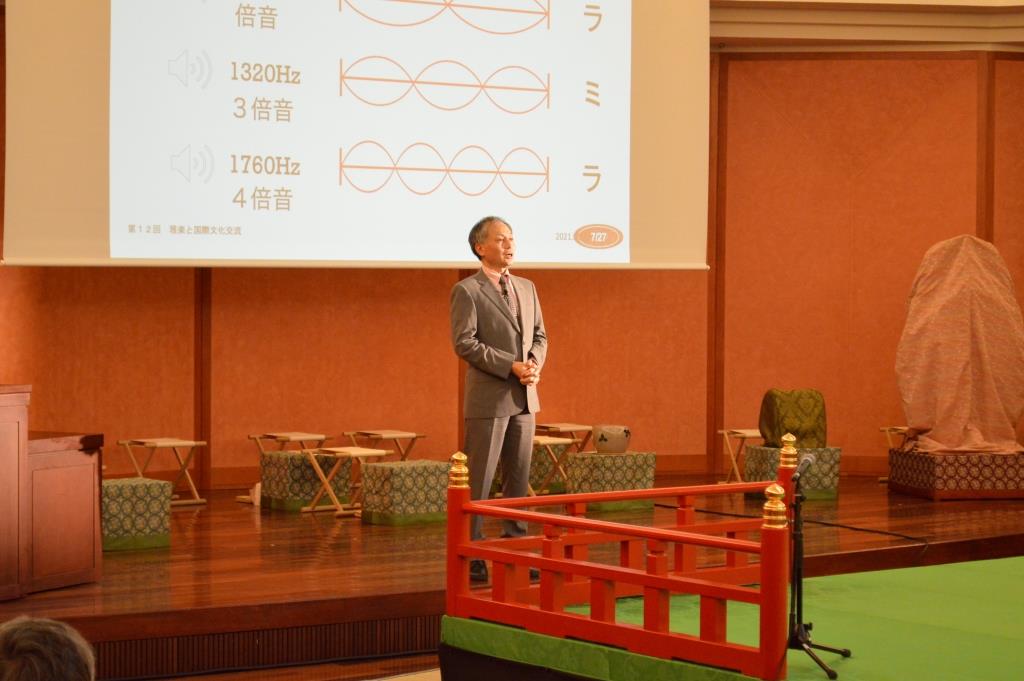 第一部は、東大・生産技術研究所の羽田野直道教授より、「和音の科学」をテーマに講演をいただきました。音階を「音は波である」とする物理学の公式に基いた定義のもと、和音の構成をわかりやすく解説。ピタゴラスの絶対律及び中国の三分損益法によって音階が決められた根拠を紐解かれると共に、東西の和音と不協和音の嗜好について考察されました。平安時代の文化の粋である雅楽の調べには意図的な不協和音が見られること、又現代にあってもストラビンスキーの「春の祭典」、あるいはロックミュージックを事例に不協和音が認められる事象から、音階の歴史的変遷について論理的に分析される画期的な講演となりました。